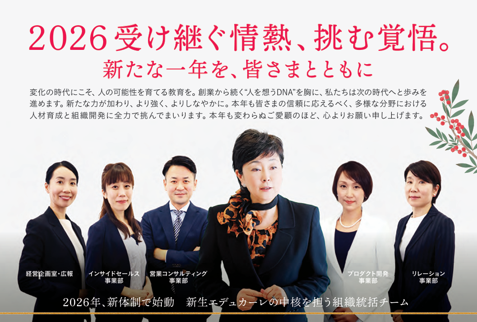 代表幡地より新年のご挨拶 2026 By EDUCARE2026年1月5日2026年1月5日Work 明けましておめでとうございます。日ごろより当社に寄せられる温かいご支援に、心より御礼申し上げます。 新しい年を迎えるにあたり、皆さまへご挨拶を申し上げます。 いま、社会はかつてないスピードで変化し続けています。深刻化する人手不足、急速な技術革新、働き手の価値観の多様化。販売・接客現場ではサービス品質の揺らぎも顕在化し、多くの企業がこれまでの延長線では解決できない課題に直面しています。 こうした時代だからこそ、「人が持つ可能性」を育てる教育の重要性は、一段と高まっていると強く感じています。 創業以来、私たちは“人を想うこと”を大切にしてまいりました。マニュアルではなく“人を見る”姿勢、型にはめない“自然体の成長支援”、そして現場に寄り添い続ける“生きた教育”。この原点は、変化の時代においてこそ価値を発揮すると確信しています。 2026年、当社は新体制のもと、新生エデュカーレとして新たな一歩を踏み出します。多様な分野のプロフェッショナルが集まる組織統括チームを中心に、より強く、よりしなやかに。 お客様の課題解決に向け、これまで以上に価値あるご提案ができるよう全社一丸となって取り組んでまいります。本年も、皆さまの信頼にお応えできるよう、人材育成と組織開発に全力で挑んでまいります。変わらぬご愛顧のほど、心よりお願い申し上げます。 2026年1月1日 株式会社エデュカーレ 代表取締役社長 幡地 嘉代 HOME